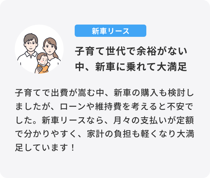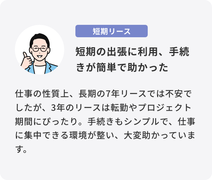 - 「一台の新車にじっくり乗りたい」なら年単位契約のリース、「用途やその期間だけ乗りたい」なら7日間から利用できるサブスクが最適です。お客様の目的に合わせてお選びください。